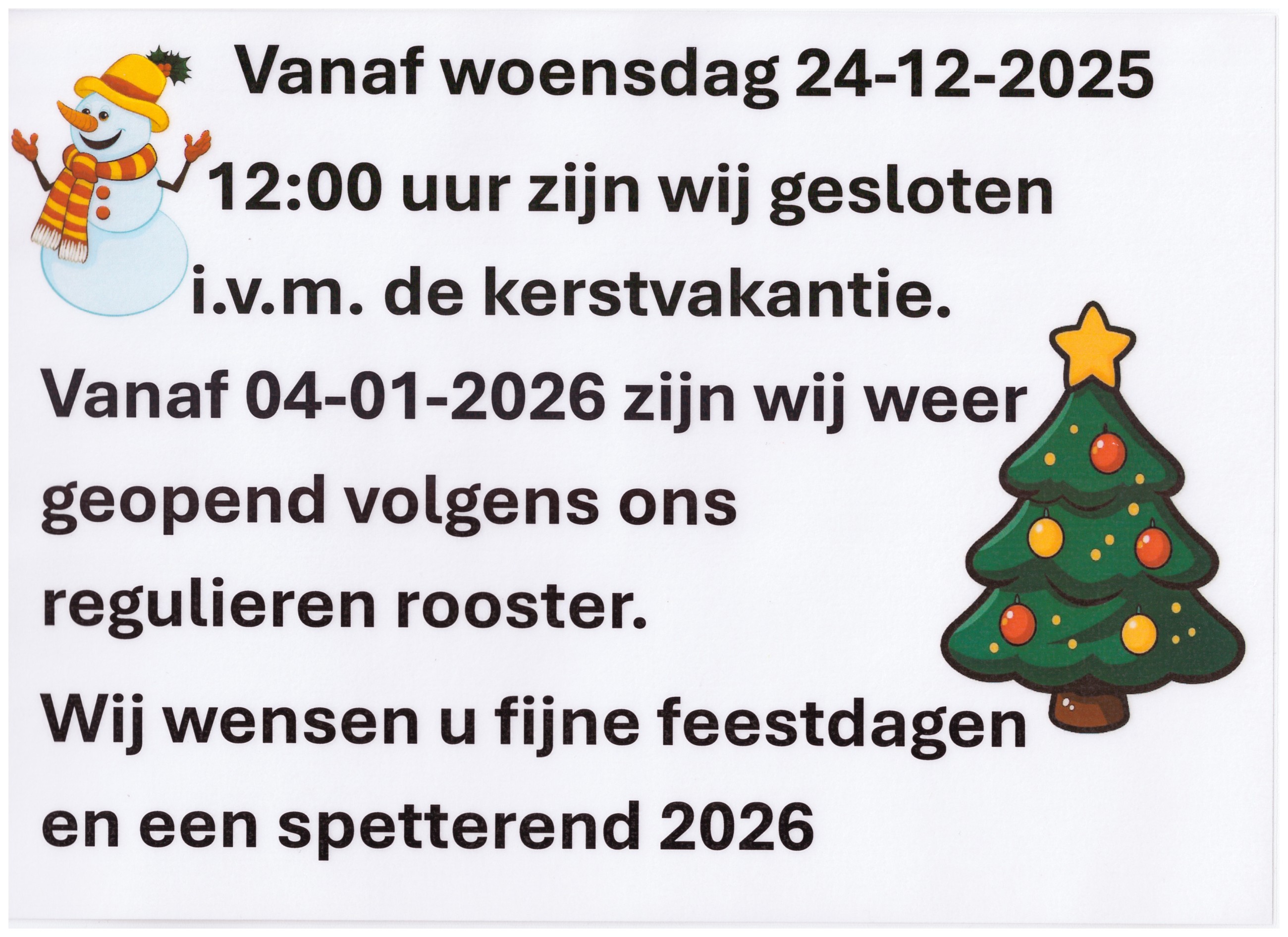 Vanaf 4 januari zijn we weer geopend volgens het regulieren rooster.